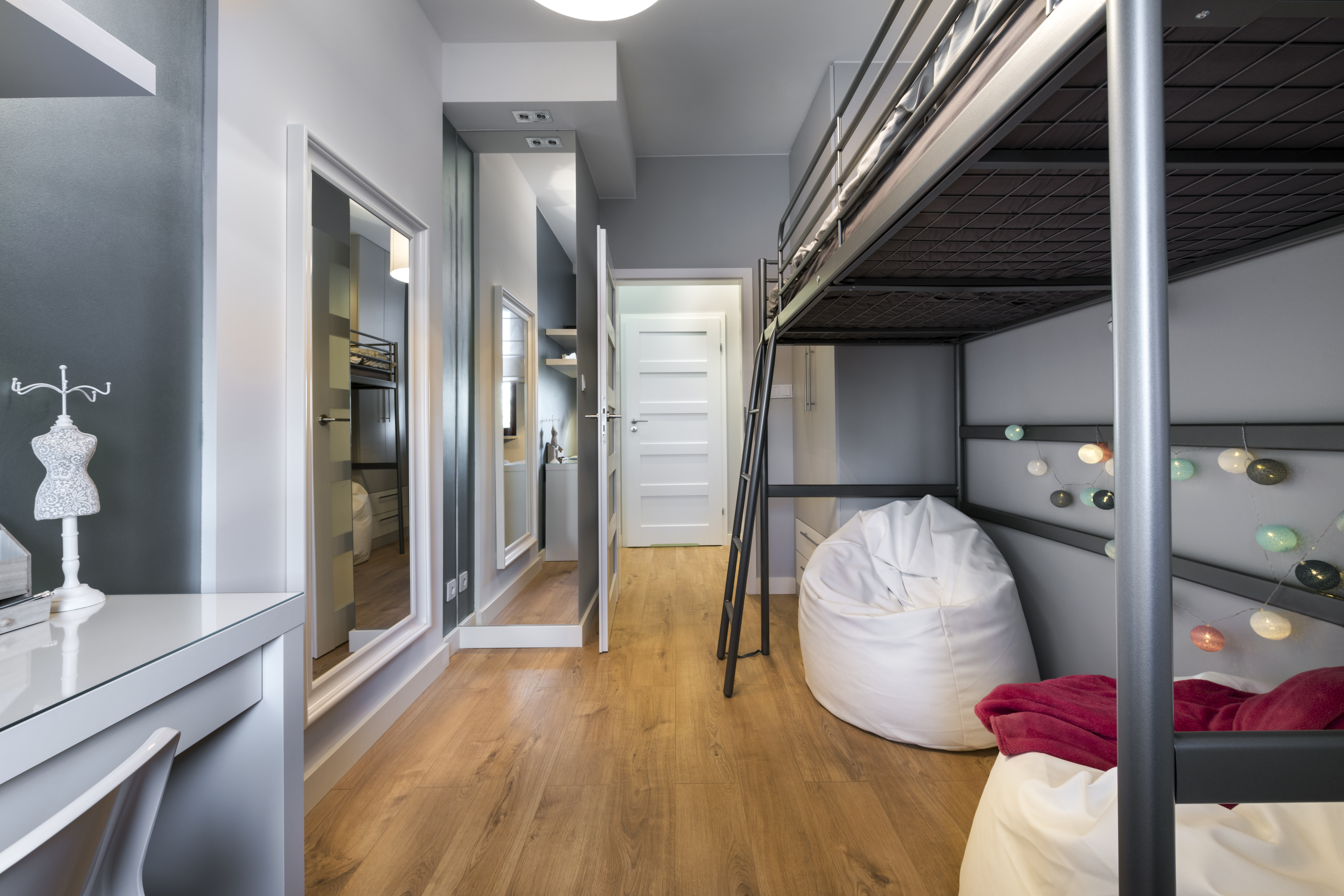 Modern room featuring a private balcony, furnished with a bed, desk, and wardrobe. Near parks and cafes.